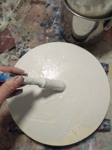 Préparer le blanc de Meudon: Chauffer la colle de peau de lapin à 40° puis y rajouter le Blanc de Meudon jusqu’à saturation. Le premier jour, appliquer une couche de Blanc « pochée » avec un pinceau rond, recto verso.