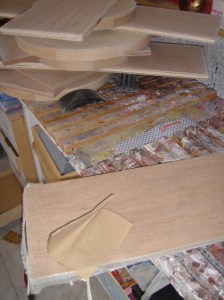 La laque se fait sur contreplaqué marin multiplie de 15 mm d’épaisseur. Il faut le poncer grossièrement pour rayer la surface au papier de verre