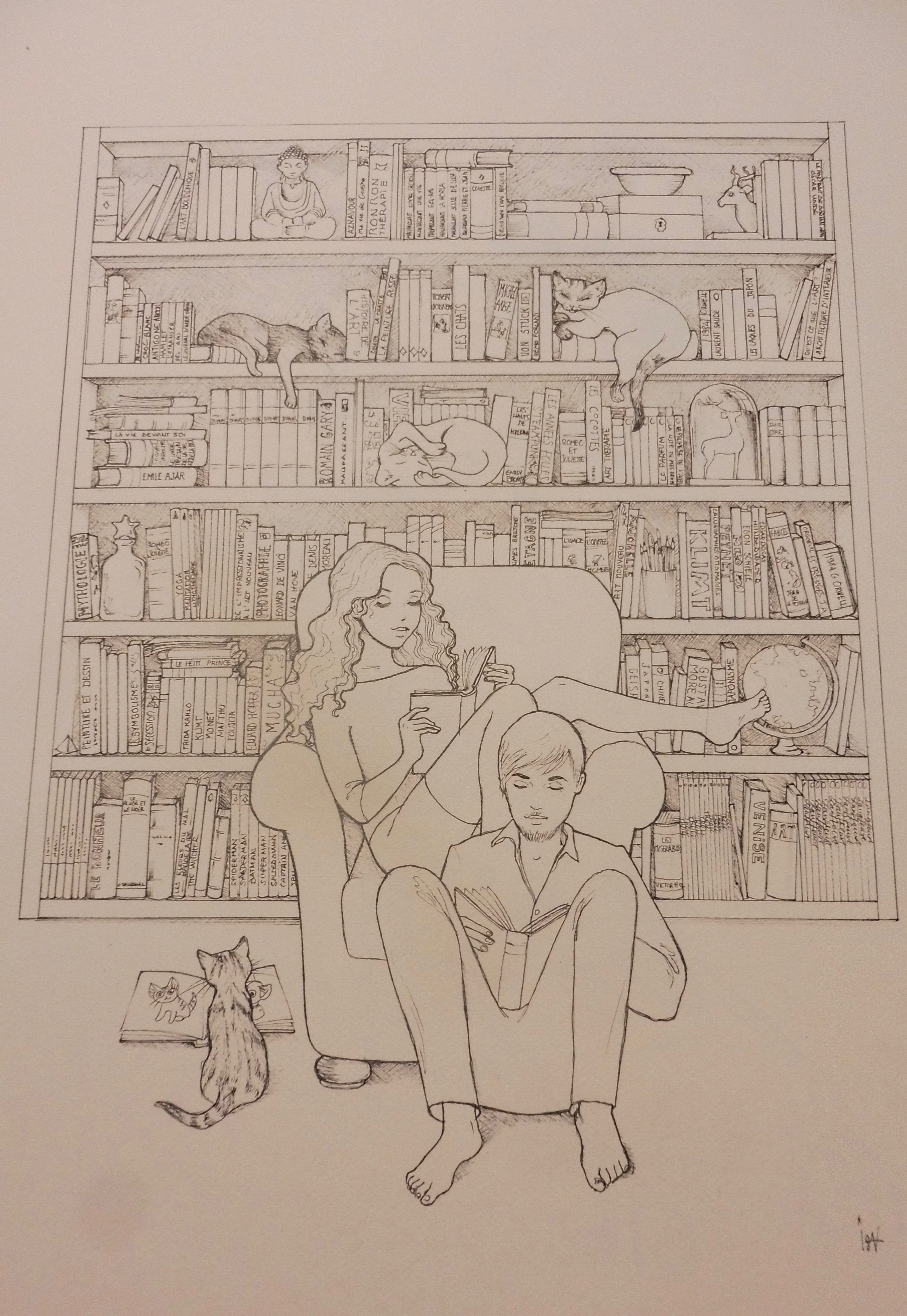 Un chat passant parmi les livres,